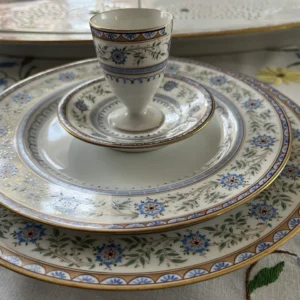 Fragment serwisu stołowego – 2 płaskie talerze duży i mały, kieliszek do jajka, półmisek do ryby z dwuczęściowym rusztem na odsączanie wody. Porcelanowy serwis stołowy na 72 osoby zwany Kunitzerowskim lub Błękitnym został…